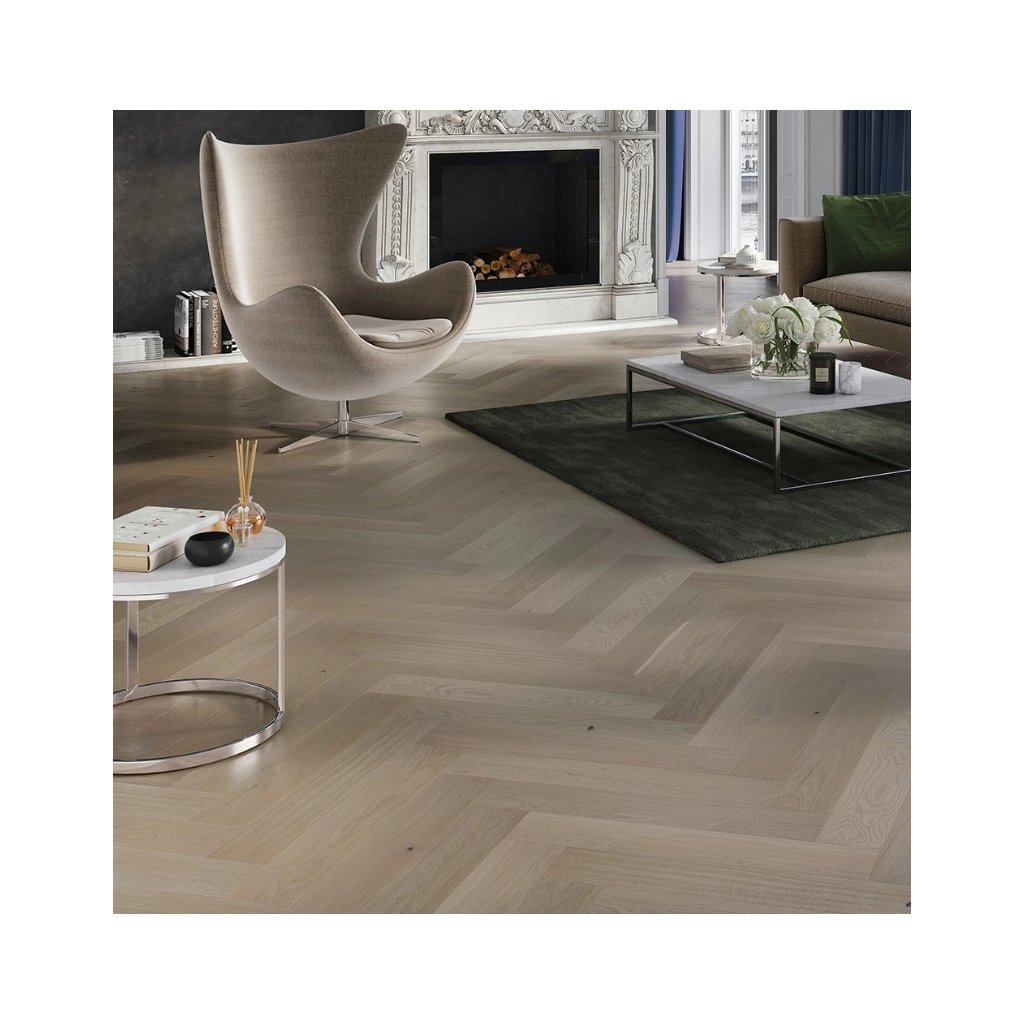 Třívrstvá dřevěná podlaha Dub Marzipan Muffin – stromeček 130 nabízí kombinaci klasického vzoru a moderní barevnosti. Tradiční stromečkové řazení prken působí elegantně a nadčasově, zatímco světlý odstín dodává interiéru vzdušnost a jemnou harmonii. Povrch je kartáčovaný, čímž vynikne přirozená kresba dubového dřeva a jeho autentický charakter.