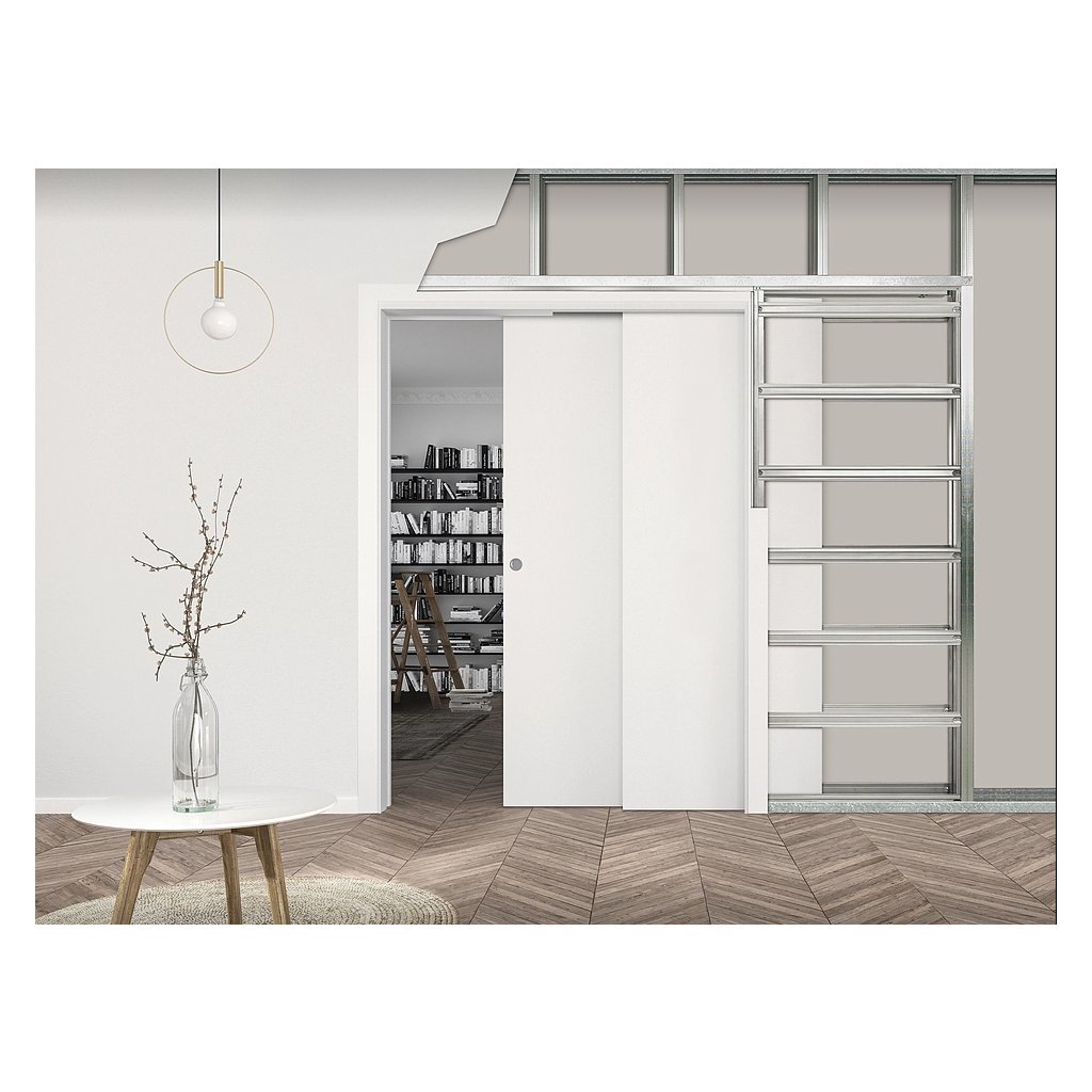 ECLISSE TELESKOP 700+700/1970 do SDK - dvoukřídlé stavební pouzdro pro instalaci do sádrokartonové příčky, které elegantně schová dvě dveřní křídla, pohybující se teleskopicky za sebou, do jedné kapsy, takže stavebně postačí jedno pouzdro. Je vhodné pro novostavby i rekonstruované prostory.