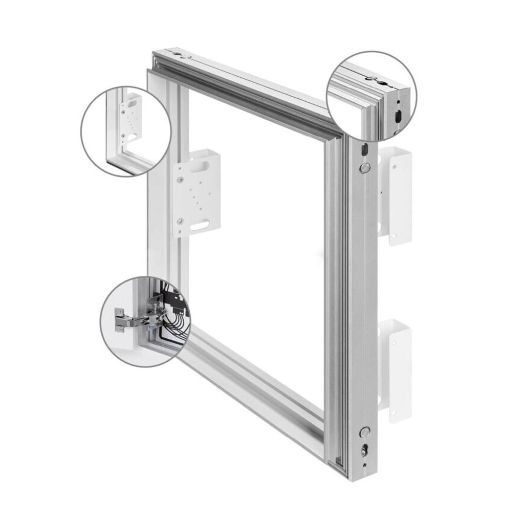 Technická dvířka standardně dodáváme s panty, které lze otočit do 165°. Díky tomu zůstanou Vaše skryté prostory maximálně přístupné. Skryté panty lze nastavit ve 3 osách pro zajištění dokonalého estetického výsledku. Rám dvířek lze zabudovat do zdiva nebo do sádrokartonu.